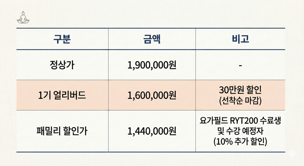 | 패밀리 할인가 | 1,440,000원 | 요가필드 RYT200 수료생 및 수강 예정자 (10% 추가 할인) |